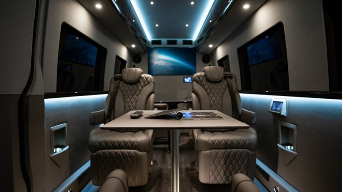 该车基于奔驰Sprinter 3500厢式车打造。内部采用完全可定制的地板和内饰。外观可以选择防弹材料。内部可以容纳五名乘客,并且仍有空间可以倾斜座椅,放松身心。角落办公室有一把旋转椅,其余座椅是四组电动调节的车长椅。