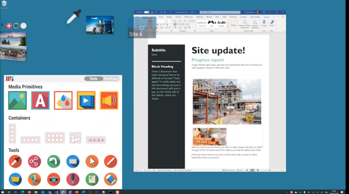在微软的演示视频中,着重展示了SurfaceFleet在软件方面的应用。在演示中,SurfaceFleet表现为一个名叫“Applets”的小组件,Applets这个小组件可以充当媒体的占位符、多媒体容器、编辑工具等角色。