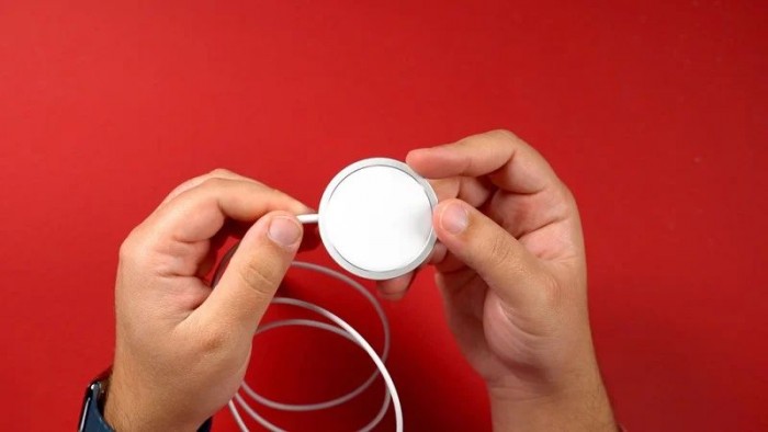 不过在包装内并不包含充电头,只是提供了一根 USB-C 的电缆,因此用户还需要单独购买 USB-C 的充电头。目前苹果官方推荐使用售价为 19 美元的 20W USB-C 充电头。连接MagSafe充电器的电线是不可拆卸的,充电器本身是由铝制的,但前部中间部分有一种类似橡胶的抓地感。