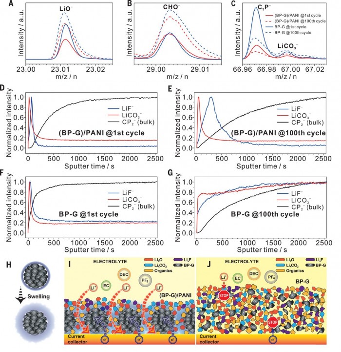 为此,季恒星团队采用“界面工程”策略将黑磷和石墨通过磷碳共价键连接在一起,在稳定材料结构的同时提升了黑磷石墨复合材料内部对锂离子的传导能力。针对电极材料在工作过程中会被电解液逐渐分解的化学物质所包裹,部分物质会阻碍锂离子进入电极材料,就像玻璃表面的灰尘阻碍光线穿透一样。研究团队用轻薄的聚合物凝胶做成防尘外衣“穿”在黑磷石墨复合材料表面,使锂离子得以顺利进入。