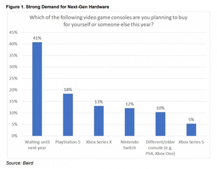 据Baird Equity Research的调查,超过三分之一的美国玩家打算在今年内购买次世代主机。Baird高级研究分析师Colin Sebastian在给投资者的一份报告中称,在对近1,000名美国消费者进行采访后,结果显示,新主机的需求要强于预期,其中18%的受访者计划今年购买PS5,13%的受访者希望会获得Xbox Series X,还有5%的人打算购买Xbox Series S。