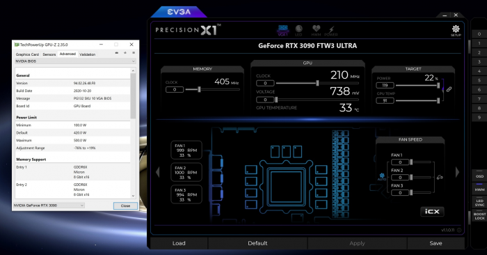 EVGA日前宣布推出GeForce RTX 3090 FTW3 Ultra显卡的新BIOS,这个显卡支持默认及OC两种BIOS,前者的功耗上限在420W,后者原本最高也是450W,现在进一步解锁到了500W。