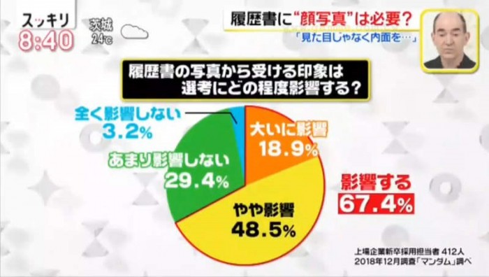 根据一项2018年的调查,412位在日本上市公司筛选应届新人的人资当中,有18.9%认为照片会“大大影响”录取与否。48.5%认为“算是会影响”。而29.4%认为“不太会影响”,只有3.2%认为“毫无影响”。