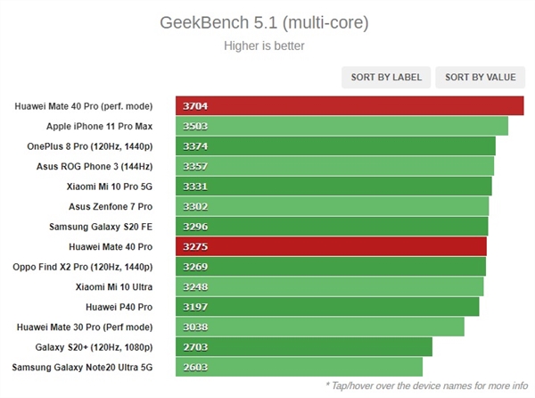 不过在单核分数下,Mate 40 Pro要落后iPhone 11,两者对应的分数为1332和1020,两者分列前两名。