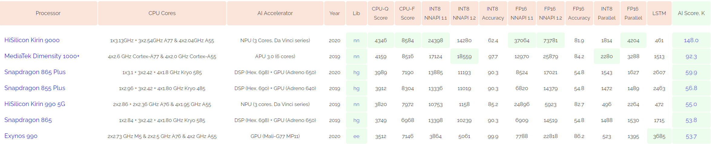 芯片榜中,麒麟9000总分148夺得第一,领先联发科天玑1000+多达60%。并且在CPU-Q、CPU-F、INT8整数运算(NNAPI 1.1)、FP16(NNAPI 1.1/1.2)中均保持绝对领先。