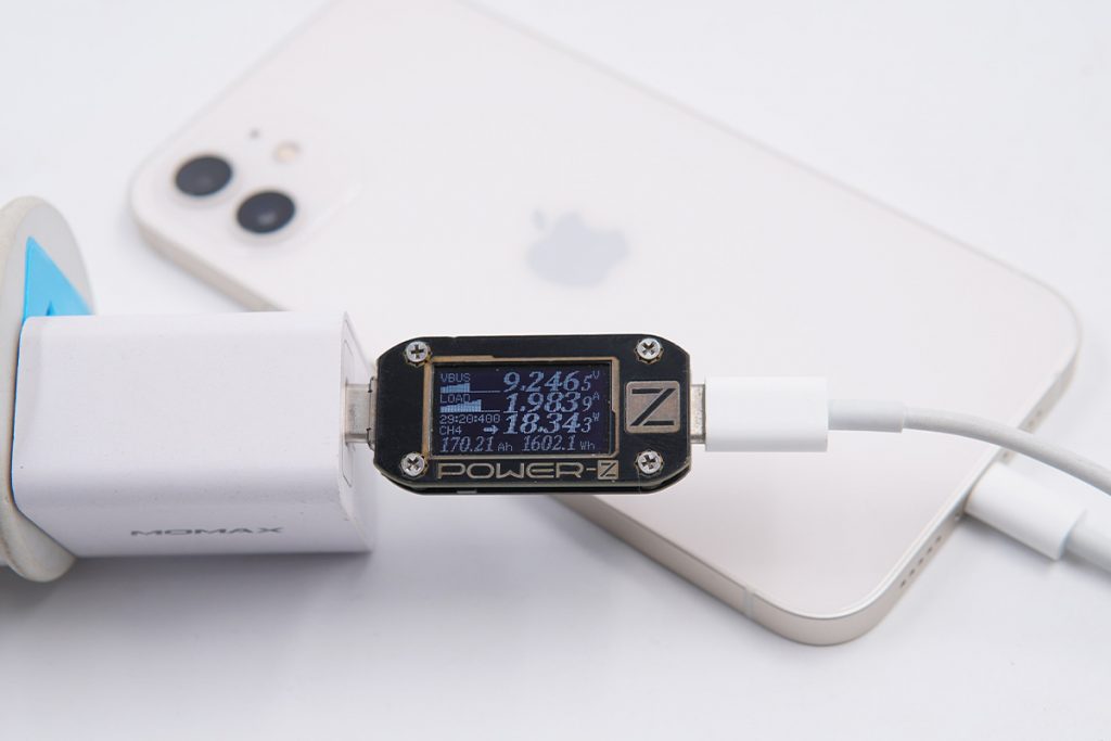 使用MOMAX摩米士 18W PD UM10CN充电器为iPhone 12充电,电压9.25V,电流1.98A,功率18.32W。