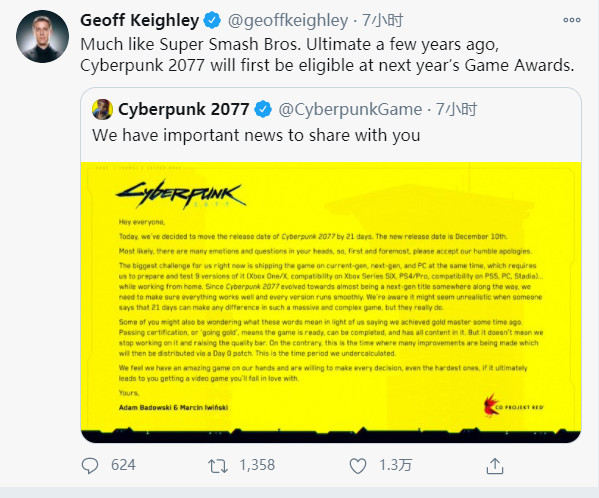 一觉醒来,让人意外的是《赛博朋克2077》又跳票了,在让某些粉丝失望的同时,恐怕也给自身带来了伤害。今天TGA(游戏大奖)创始人兼主持人Geoff Keighley发推,他表示和几年前的《任天堂明星大乱斗特别版》一样,《赛博朋克2077》将是首个有资格入围2021年游戏大奖的游戏。这意味着《赛博朋克2077》将失去TGA 2020所有大奖的评选资格,包括年度游戏。