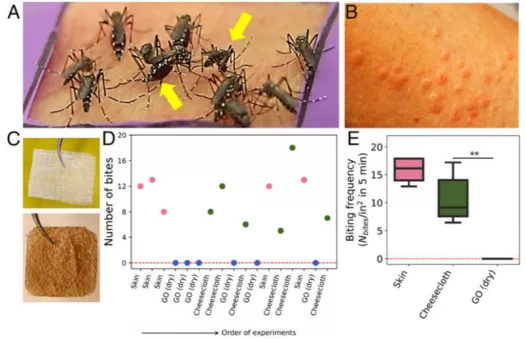图A是蚊子的聚餐时候的照片,图B就是被叮之后的皮肤。图C 上面是纱布下面是氧化石墨烯(GO)纳米片。纱布是对照组实验。图D和图E是实验组和对照组实验的统计结果。可以看得到Skin代表的是裸漏的皮肤,而Go(dry)是干燥的石墨烯片,cheesecloth是纱布的意思。