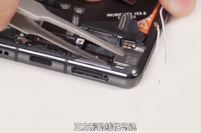 正方形的马达被放置在手机背面的最右下角的位置。