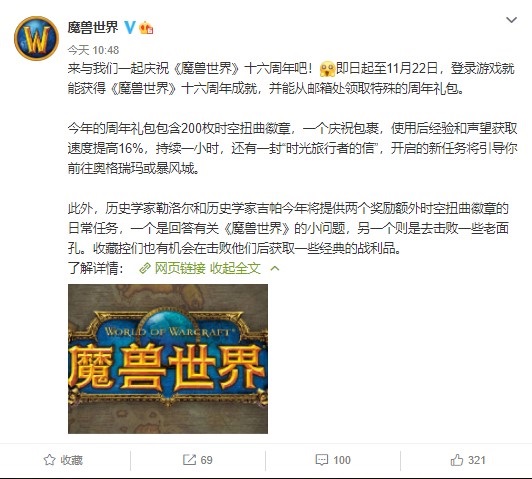 即日起至11月22日,登录游戏就能获得《魔兽世界》十六周年成就,并能从邮箱处领取特殊的周年礼包。今年的周年礼包包含200枚时空扭曲徽章,一个庆祝包裹,使用后经验和声望获取速度提高16%,持续一小时,还有一封“时光旅行者的信”,开启的新任务将引导你前往奥格瑞玛或暴风城。