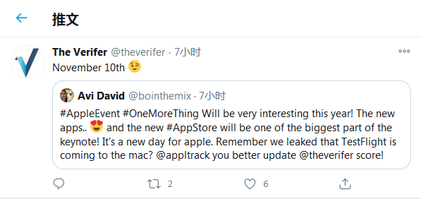 今天,苹果发布邀请函确认将会在11月10日举行下一场特别活动,主角可能是首款搭载 Apple Silicon 处理器的 Mac 设备。而根据 The Verifier 分享的最新谣传,苹果有望在本次特别活动中宣布面向 Mac 设备的 TestFlight 平台。