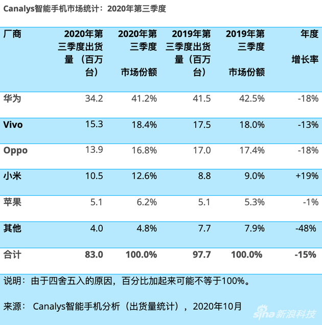 市场研究机构Canalys发布第三季度中国智能手机市场出货量报告。报告指出,中国智能手机市场出货量8300万台,较上季度减少8%,较去年下降15%。华为依然处于领导地位,随后是vivo、OPPO和小米,苹果排名第五。