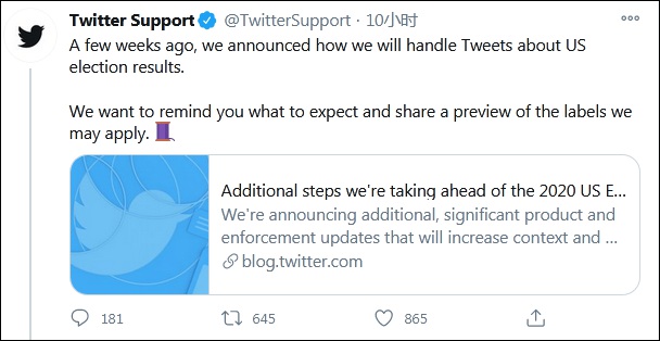 11月2日,推特更新了公告,称考虑到新冠疫情催生了史无前例的邮寄选票数,因此各地的选举结果可能无法在选举之夜及时公布。所以从大选开始一直到就职典礼结束,那些在官方结果公布前自行宣布结果的账户或推文将被贴上警告标签。