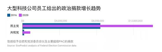 相比于2016年的特朗普-克林顿竞选,大型科技公司员工在今年的特朗普-拜登竞选中更为慷慨。他们给予民主党的捐款从850万美元增长至1400万美元,涨幅近70%。与此同时,大型科技公司员工对特朗普的资金支持几乎是2016年的五倍,从18万美元增长至85万美元。尽管特朗普经常会抨击他们的雇主,哪怕是在竞选的前几天。