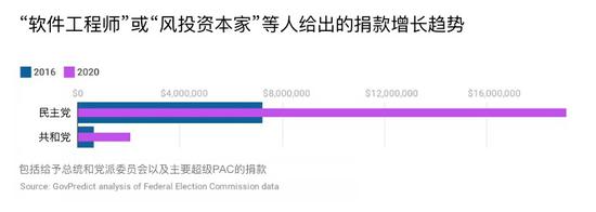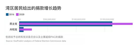 居住在被认为属于旧金山湾区的9个县的人们,在2020年给民主党的捐款比2016年的增加了22%,从大约1.63亿美元增加到1.99亿美元。(这些数字均包括民主党超级捐赠人和旧金山本地人汤姆·施泰尔的捐款。施泰尔未涉足科技行业,但在2016年和2020年均捐赠了数千万美元。)