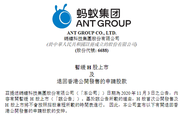 11月4日早间消息,蚂蚁集团在港交所发布公告称,暂缓H股上市及退回香港公开发售的申请股款。公告表示,兹提述蚂蚁科技集团股份有限公司(“本公司”)日期为2020年11月3日之公告,内容有关暂缓H 股上市(“该公告”)。基于该公告所载的理由,H股首次公开发售及H股上市将不会按照招股章程所载的时间表进行。因此,本公司宣布以下有关退回香港公开发售的申请股款的安排。