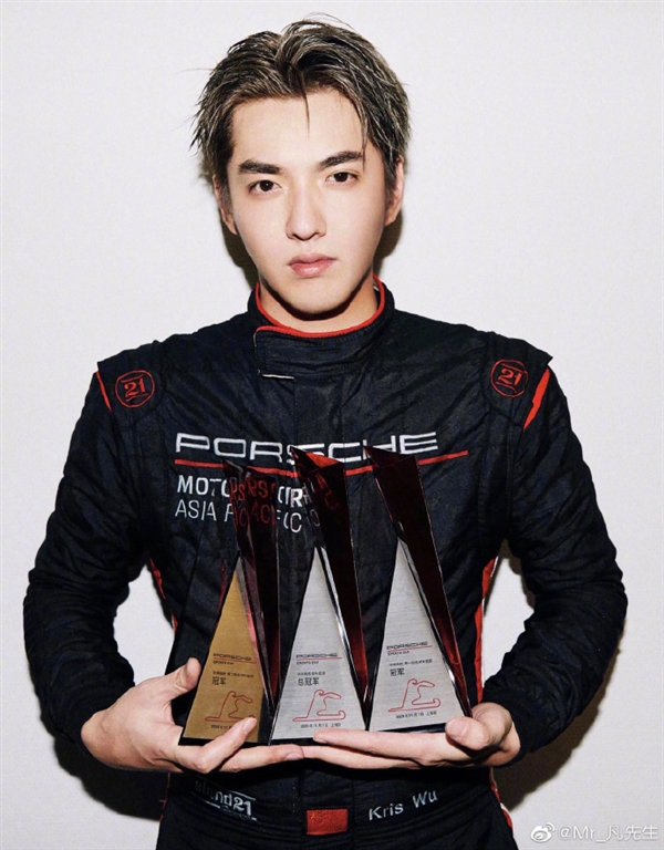 随后,吴亦凡在微博晒出在赛车生涯获得首冠军的后台照,连配三个奖杯的emoji,心情很好。