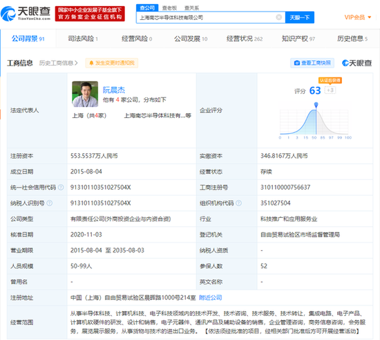 天眼查信息显示,上海南芯半导体科技有限公司成立于2015年8月,法定代表人为阮晨杰,经营范围包括从事半导体科技、计算机科技、电子科技领域内的技术开发、技术咨询、技术服务、技术转让,集成电路、电子产品、计算机软硬件的研发、设计和销售等。