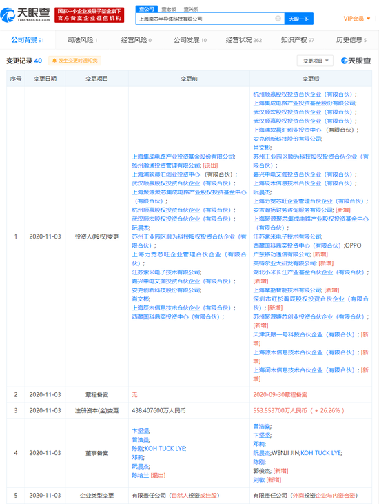 11月4日下午消息,天眼查App显示,近日,上海南芯半导体科技有限公司发生多项工商变更,新增股东湖北小米长江产业基金合伙企业(有限合伙)、OPPO广东移动通信有限公司、深圳市红杉瀚辰股权投资合伙企业(有限合伙)等。