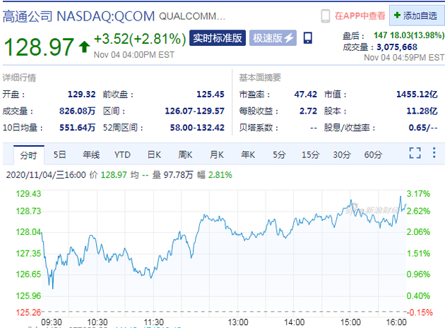 高通今日发布了2020财年第四财季及全年财报。高通第四财季业绩超出华尔街分析师预期,而且对2020财年第一财季调整后每股收益的展望也超出预期,推动其盘后股价涨超13%。当日,高通股价在纳斯达克常规交易中上涨3.52美元,报收于128.97美元,涨幅为2.81%。