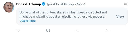 Twitter在特朗普发布和转发的11条内容上添加了事实核查标签。大多数标签显示,特朗普分享的内容“在大选或其他公民流程方面存在争议,可能具有误导性”。在一条Twitter消息中,特朗普单方面宣布赢得了宾夕法尼亚州、佐治亚州和北卡罗来纳州的选举。但Twitter的标签显示,这些州的结果尚未最终宣布。
