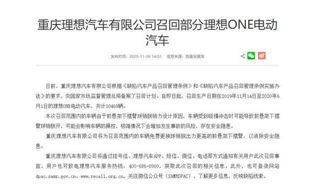 据国家市场监督管理总局显示,日前,重庆理想汽车有限公司根据《缺陷汽车产品召回管理条例》和《缺陷汽车产品召回管理条例实施办法》的要求,向国家市场监督管理总局备案了召回计划。自即日起,召回生产日期在2019年11月14日至2020年6月1日的理想ONE电动汽车,共计10469辆。