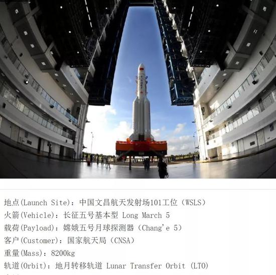 嫦娥五号探测器全重8.2吨,由轨道器、返回器、着陆器、上升器四个部分组成,将由我国目前推力最大的长征五号运载火箭从中国文昌航天发射场进行发射。