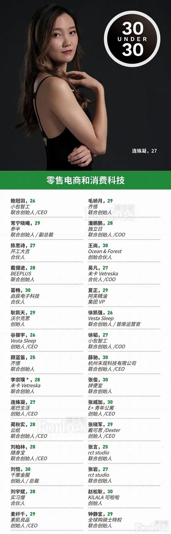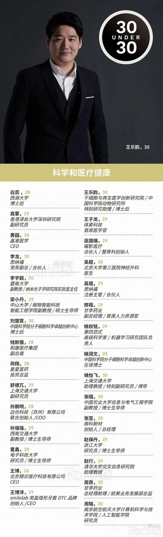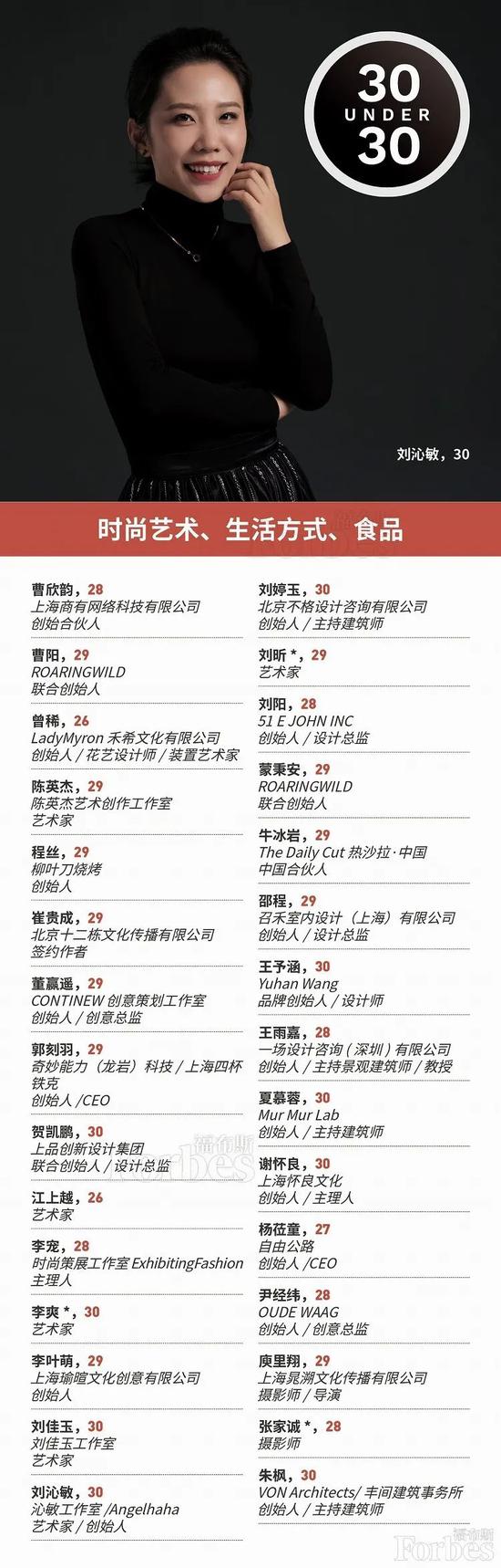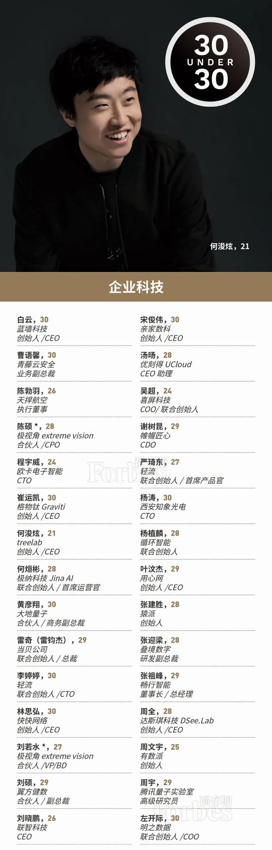 以下为2020福布斯中国30岁以下精英榜(30 Under 30),名字后标*为福布斯亚洲上榜者,名字后标#为截止10月已离开原机构。