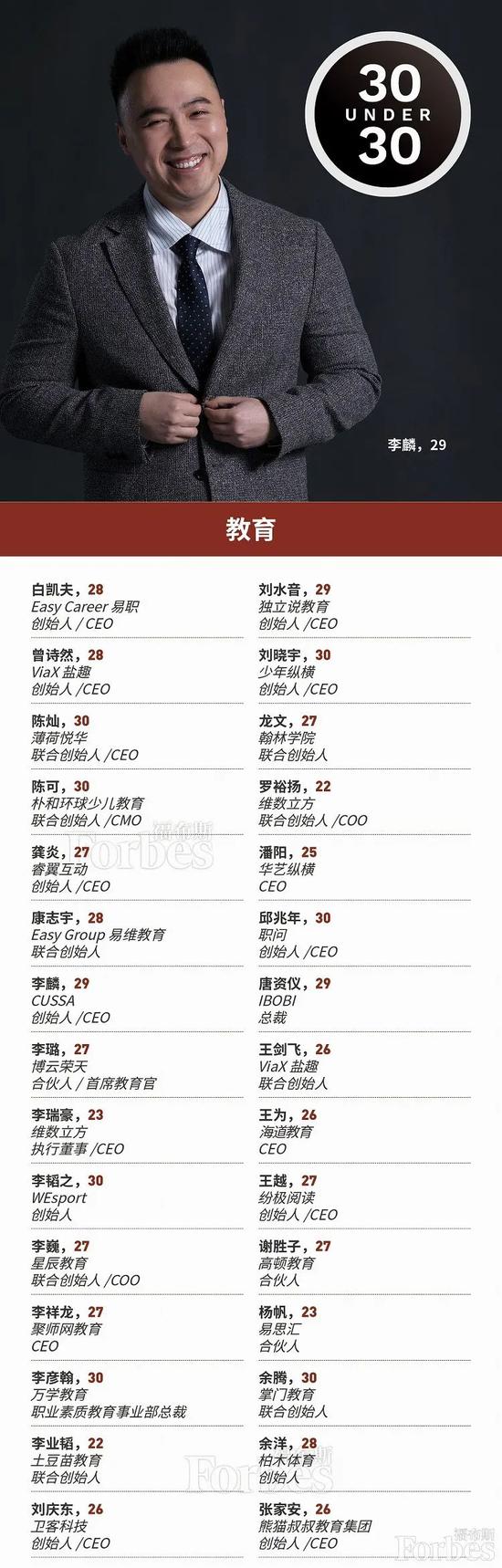 这项评选被称为30 Under 30(下称U30)。这些青年精英包括创业家、杰出的经理人和演艺、体育、科技及文化界人士。他们是未来的新星,他们砥砺前行,不负韶华,在平凡中铸就伟大!