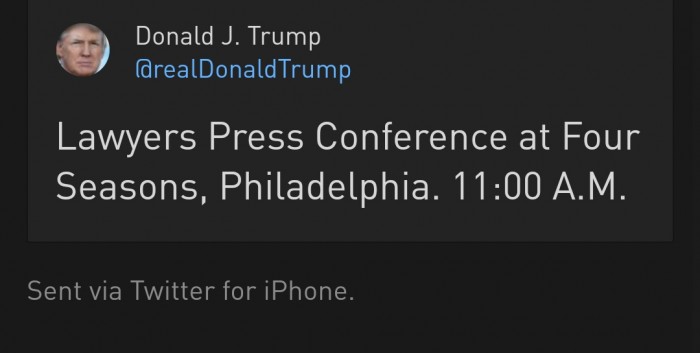 Four Seasons Total Landscaping发布会或许就是特朗普竞选最后垂死挣扎的象征性缩影。交接,特朗普此前在社交媒体平台上多次宣布将在费城举办一场大型新闻发布会,然而他一开始说是著名的四季酒店,后来却改成是一家园林公司。目前不知道特朗普竞选团队为何选择了费城郊区外的一家企业,但看起来像是一场乌龙事件。