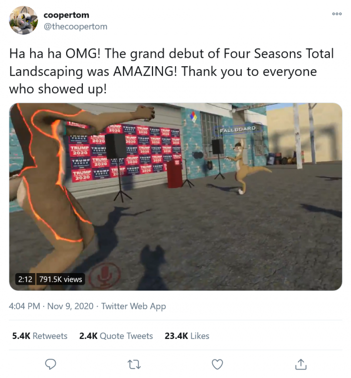 不管怎样,Four Seasons Total Landscaping已经成为这个周末最具代表性的网络迷因之一,它为互联网提供了无尽的娱乐,同时也让一家打广告宣传草坪维护和扫雪的小企业成为了焦点,而这最终可能会成为特朗普竞选团队诗意十足的告别仪式。