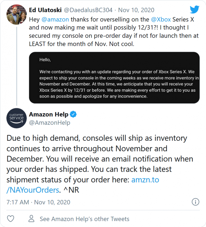 希望Xbox Series X的预定时间不要太长,但当然,那些预订后只收到通知邮件的人会很沮丧,这是可以理解的。他们中的许多人在Twitter上发表了自己的看法,亚马逊服务支持账号则在Twitter上做出了回应:“由于需求旺盛,游戏主机将会陆续发货,库存将在11月和12月持续到货。当您的订单发货后,您将收到一封电子邮件通知。”