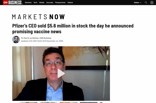 当地时间9日,美国制药巨头辉瑞宣布了其新冠疫苗的利好消息,随后该公司股价飙升。美国有线电视新闻网(CNN)等多家美媒11日报道披露,该公司首席执行官阿尔伯特·布尔拉(Albert Bourla)当天出售了自己持有的数百万美元公司股票,辉瑞方面称此举是8月就早已制定好的计划。