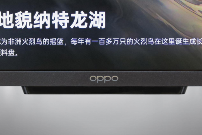 OPPO智能电视S1正面采用了一块65英寸4K QLED悬浮屏,可视屏占比达到了惊人的98.6%。四边窄边框设计,仅在下方印有OPPO标识。