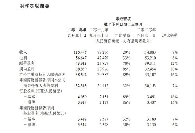 11月12日,腾讯发布截至2020年9月30日的第三季度财务报告。财报显示,腾讯在该季度的总营收为1254.47亿元(约合184.21亿美元),同比增长29%。归属于权益持有人的应占盈利为385.42亿元(约合58.3亿美元),同比增长89%。