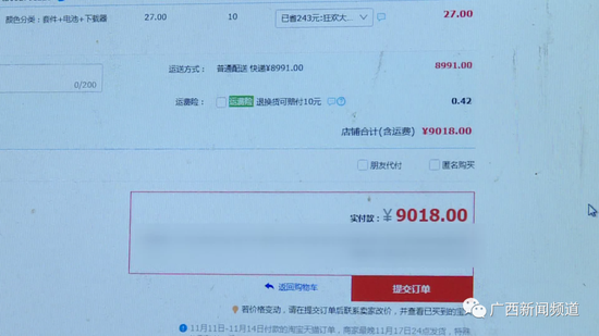 最近,南宁市民卢先生在网购时,遇到了一件奇葩的事。 卢先生想购买的商品是一种叫单片机的配件,这种配件的单价在14元-42元之间,有一个商家因为“双11”推出促销价1.7元-2.7元/个。看到有优惠卢先生就下单买了10个,就在他准备付款时订单的总金额竟要9018元。