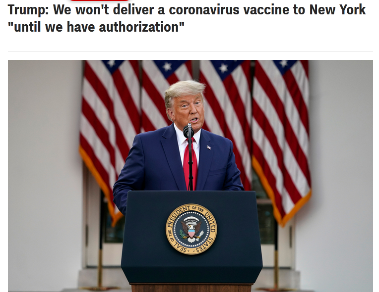 “最快4月份,所有普通民众均可接种疫苗,除了纽约州这样的地方。出于政治原因,该州州长称……希望在疫苗上花点时间”特朗普说,美国政府不能将疫苗送到“一个不会立即将其提供给人民的州”。
