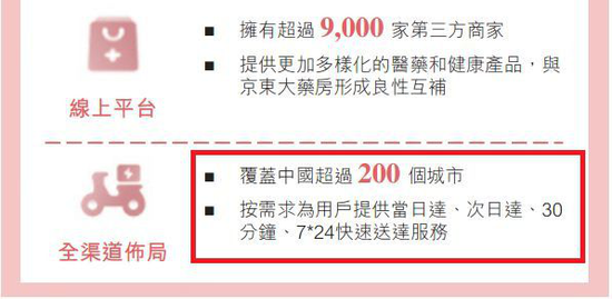 京东健康通过全渠道满足用户的用药需求,其全渠道布局目前可覆盖全国超过200个城市,按需求可为用户提供当日达、次日达、30分钟、7*24快速送达服务。