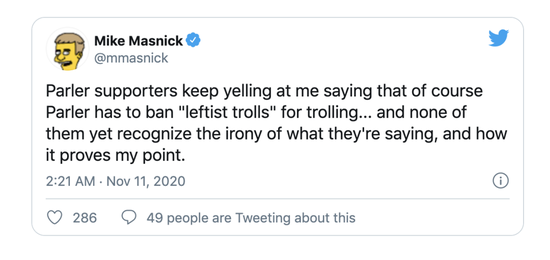 因为不轻易删帖的承诺,当假新闻造谣到Parler自己身上的时候,Parler创始人也只是出面发了一条辟谣推文,同时任由假新闻继续在Parler上传播,然后根据言论自由的原则,“由用户自己判断真伪”。也不知道创始人自己是否尴尬。
