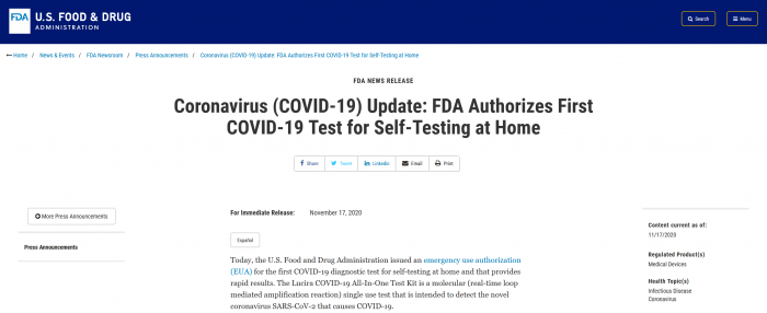 据悉,该检测试剂盒只能按处方药购买,FDA表示,开具该试剂盒的医生必须报告检测结果以便跟踪。具测试套件制造商Lucira Health介绍,他们为家庭测试人员提供了快速参考说明。检测者可以在30分钟内就可以得到结果。