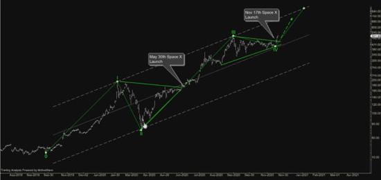 Gordon补充说,投资者押注特斯拉电动汽车领域和其CEO埃隆-马斯克(Elon Musk)旗下太空探索公司SpaceX的创新。他预测,SpaceX的卫星覆盖范围和5G的扩展可能会为特斯拉在无人驾驶汽车市场的统治地位奠定基础。他说,证明就在下图中——最近两次SpaceX发射令特斯拉股票释放了收益。
