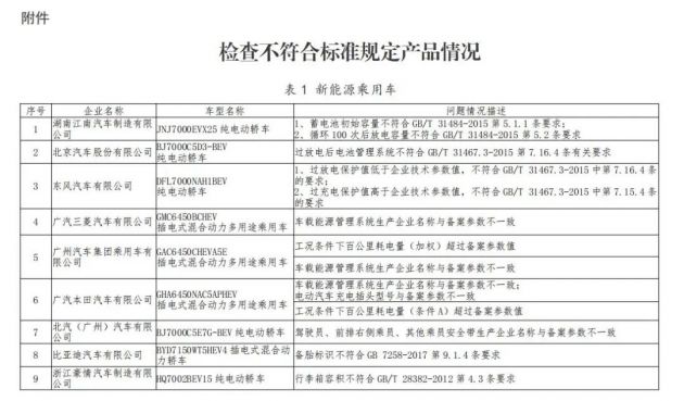 (一)新能源乘用车,共涉及9家企业的9个车型产品,涉及动力电池容量和保护功能、行李箱容积、轮胎规格、标志标识等项目不符合国家标准或管理规定。