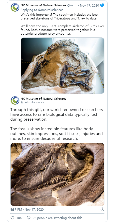 “我们还没有研究过这个标本,它是一个科学前沿。它的保存是惊人的,我们计划利用一切可以利用的技术创新来揭示霸王龙和三角龙生物学的新信息。这块化石将永远改变我们对世界上最喜爱的两种恐龙的看法。”北卡罗来纳州自然科学博物馆古生物学负责人Lindsay Zanno博士在一份声明中说。