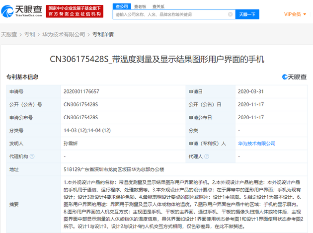 11月23日上午消息,天眼查App显示,华为技术有限公司于11月17日公布一项名为“带温度测量及显示结果图形用户界面的手机”的专利,专利类型为外观专利,摘要中显示该专利是“通过手机、平板的摄像头扫描人体或物体后,主视图界面中部显示测量的人体或物体的温度信息”。