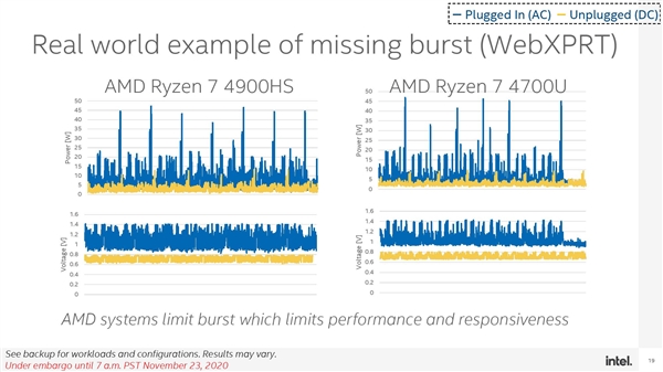 按照Intel的说法,锐龙7 4900HS、锐龙7 4700U都被发现电池供电时,性能响应延迟增加,4900HS甚至多出10秒,而且突发性能调用的特性似乎被屏蔽了。