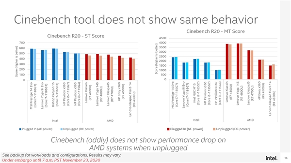 最后,Intel还指出,大家别信Cinebench,AMD锐龙对其使用的特性模型优化很好,不具参考性。为何这么说?因为拔不拔电源,R20跑分差异很小。
