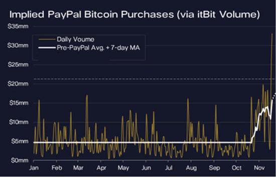 Pantera Capital估算,PayPal上线比特币业务三周内,其客户买入的比特币已经约占市场新供应币的70%。