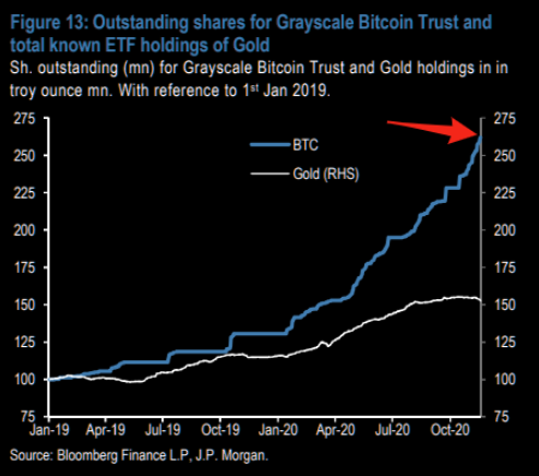 摩根大通在近日报告中注意到,美国数字货币投资机构Grayscale旗下的比特币信托Grayscale Bitcoin Trust近期份额快速膨胀,这说明在比特币这一波大涨背后,那些将比特币视为长期投资工具的机构投资者起着比量化基金更大的作用。