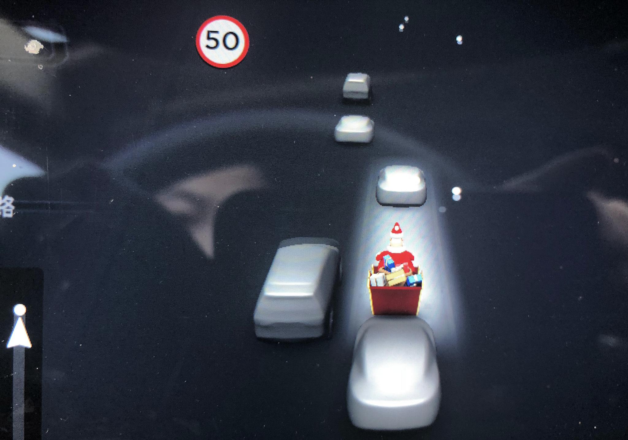 大家最熟知的想必就是特斯拉每年都会更新的圣诞彩蛋,这已经成了和John lewis家圣诞广告一样每年必刷的圣诞乐趣。比如之前的圣诞节,你会在自己的中控屏上发现一个驯鹿按钮,按下之后汽车就会在屏上“变为”雪橇:打转向灯,会有雪橇铃声;开启辅助驾驶,屏上道路会变成雪道,周边车辆会显示为驯鹿,车主自己则是圣诞老人。
