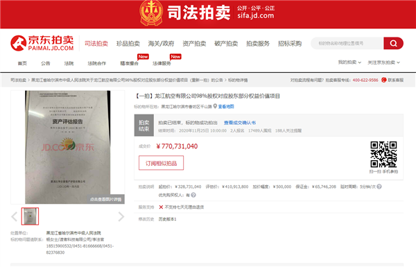 此前在9月29日,龙江航空就曾进行过一次拍卖,起拍价同样是3.29亿。在那一轮的拍卖中,北京盛达金业投资咨询有限公司以8.06亿元拍下。